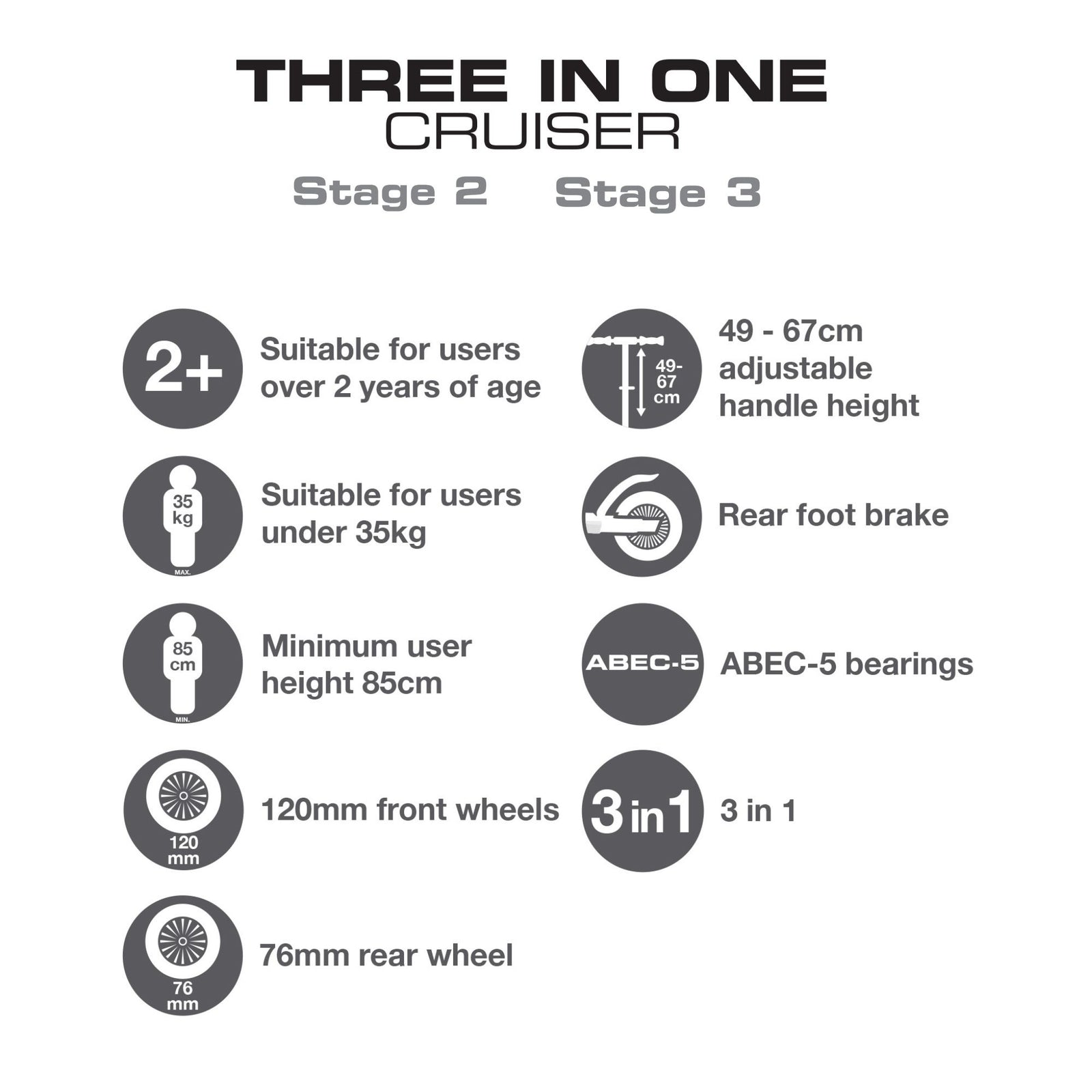 The EVO 3-in-1 Children's Scooter features a 3-stage design, from balance bike to Move N Groove Scooter. Adjustable handle heights, max weight 35kg, and a durable build ensure years of fun and development for kids aged 2+.
