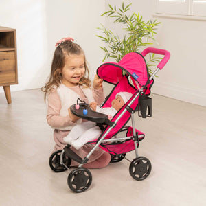 Designed with playtime perfection in mind, this pushchair brings a whole new level of fun to your child's doll collection. Whether they're strolling through the living room or hosting a make-believe playdate, the Chicco Playtime is ready for action. What sets it apart? Let's talk style. This mini pushchair rocks a chic and modern design that's sure to catch your child's eye. But it's not just about looks. The Chicco Playtime is built to withstand the excitement of play. Sturdy construction, easy-grip handles, and smooth-rolling wheels make this pushchair a joy to use. It's the perfect blend of durability and functionality. This stroller is lightweight and may be easily stored in those tricky and restricted spaces thanks to its folding umbrella function. Featuring a bead maze game on a removable tray and a detachable cup holder for your dolly's baby bottle.