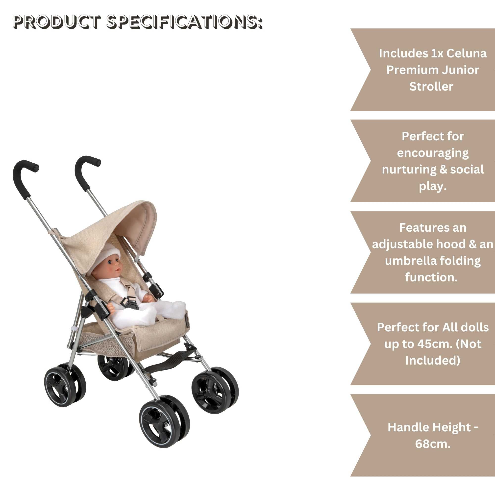 Invest in the Children's Doll Celuna Premium Stroller – a magical journey awaits your child and their cherished dolls. Elevate playtime, nurture creativity, and create lasting memories with this must-have addition to your child's toy collection.