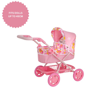 Packed with thoughtful details, the pram features a removable apron, an adjustable hood, and under seat storage—perfect for carrying all those essential doll accessories. It also folds flat for easy storage and transport, making it a convenient choice for families on the go. Every outing becomes an adventure with this stylish and functional pram.