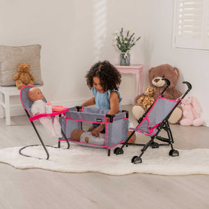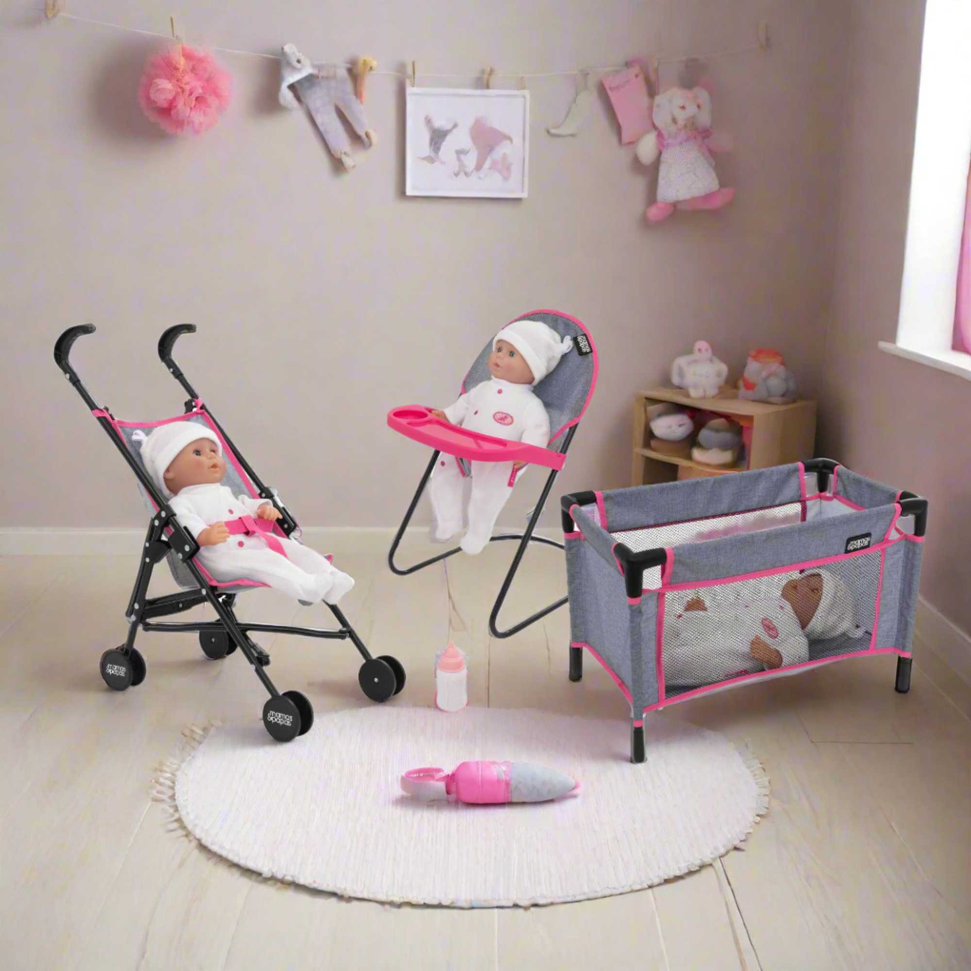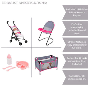 Immerse your child in the world of nurturing and imagination with the Mamas & Papas Dolls Nursery Playset in charming pink and grey. This playset isn’t just a collection of toys—it’s a complete nursery experience designed to delight and inspire young caregivers.
