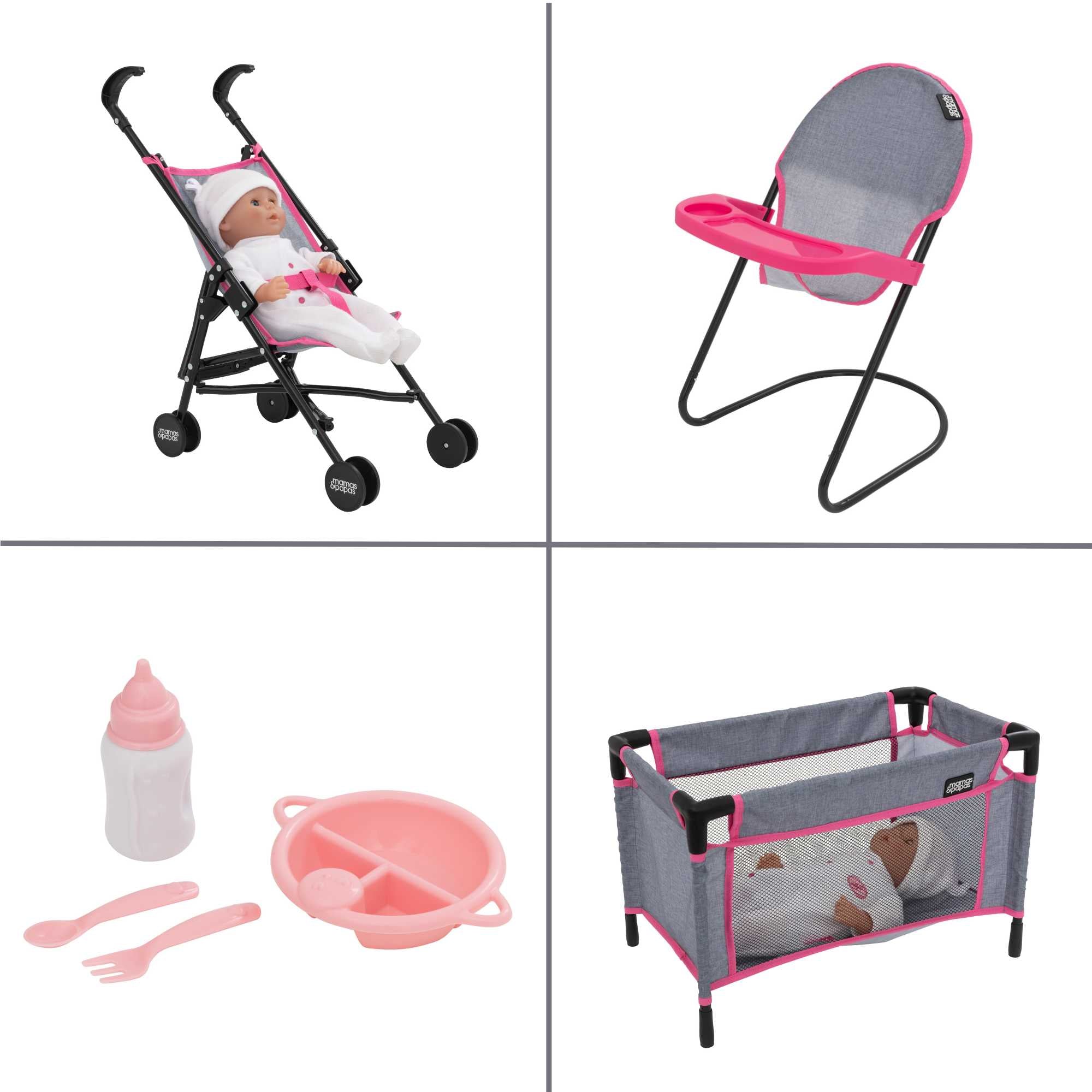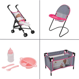 • Includes 1x M&P Dolls Cot, 1x M&P Dolls Stroller/Buggy, 1x M&P Dolls Highchair/Baby Chair, 1x Reusable Plat, 1x Baby Dolls Bottle & 1x Reusable Cutlery Set.