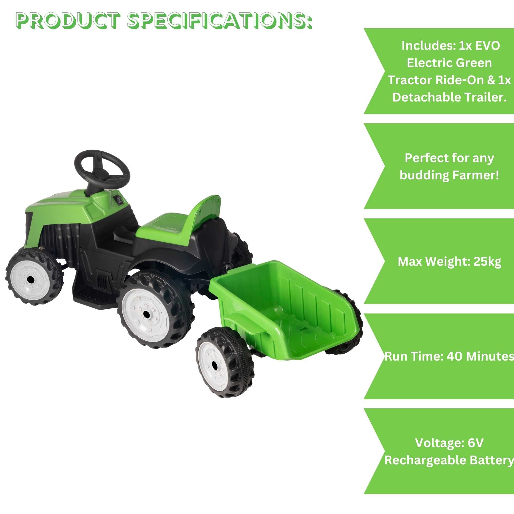 The EVO Green Tractor & Trailer Ride-On isn’t just a toy; it’s a gateway to imagination and adventure. It’s the excitement of exploring the backyard farm, the joy of loading and unloading the trailer, and the pride of doing it all on their own. Watch as your child’s confidence and coordination grow with every ride, and enjoy the satisfaction of giving them a safe, reliable, and incredibly fun toy.