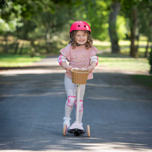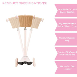 The EVO Mini Cruiser Scooter comes with a charming basket, perfect for carrying toys, snacks, or any small treasures your child finds along their adventures. It's not just a scooter; it's a vehicle for exploration and fun. Featuring a stable three-wheel design, the EVO Mini Cruiser Scooter ensures a smooth and balanced ride, helping young riders build confidence and coordination. The sturdy foot deck and easy-grip handlebars provide extra stability and control. With an adjustable handlebar, the EVO Mini Cruiser Scooter grows with your child. It’s designed to offer a comfortable and ergonomic riding position, ensuring years of fun as your little one gets taller. In today’s tech-driven world, the EVO Mini Cruiser Scooter is a fantastic way to encourage kids to get outside, stay active, and enjoy fresh air. It’s perfect for trips to the park, neighbourhood rides, or backyard adventures.