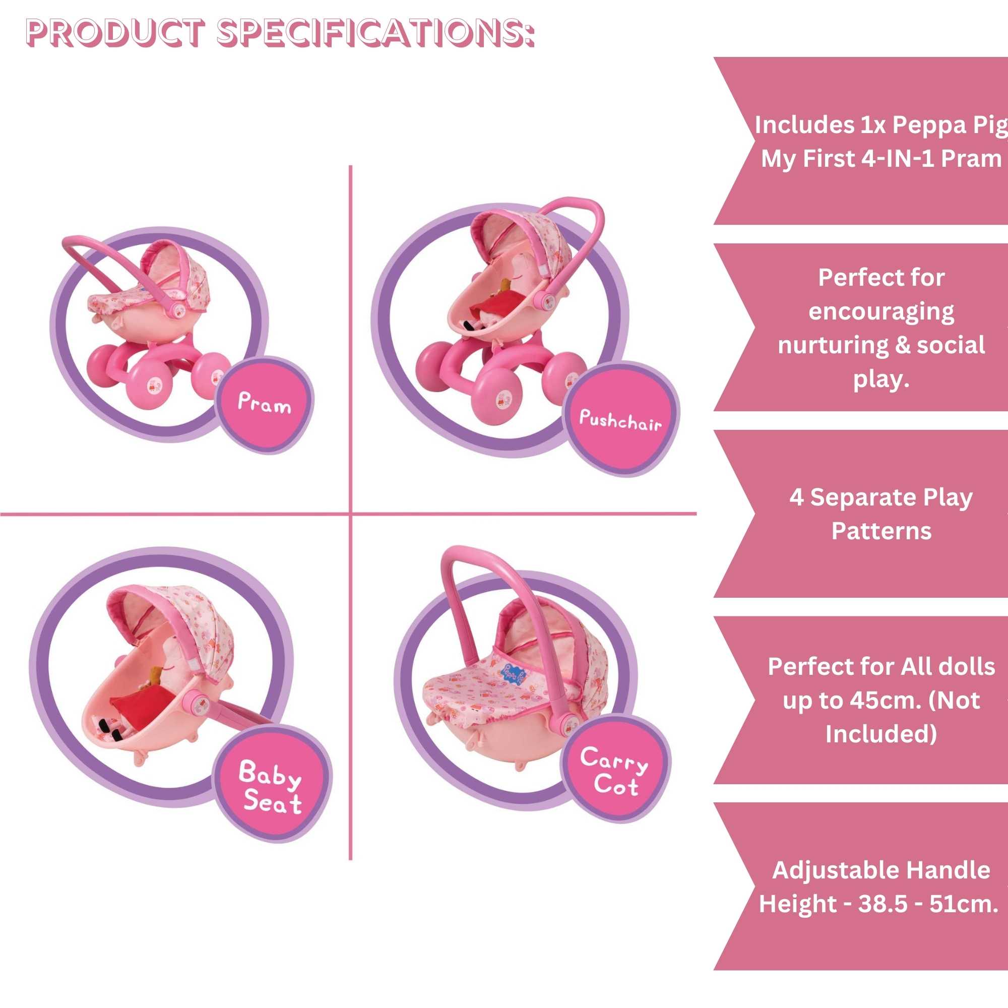 Introducing the Peppa Pig 4-IN-1 My First Pram: The Ultimate Doll Stroller for Your Little One’s Adventures!