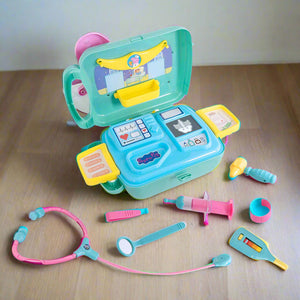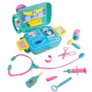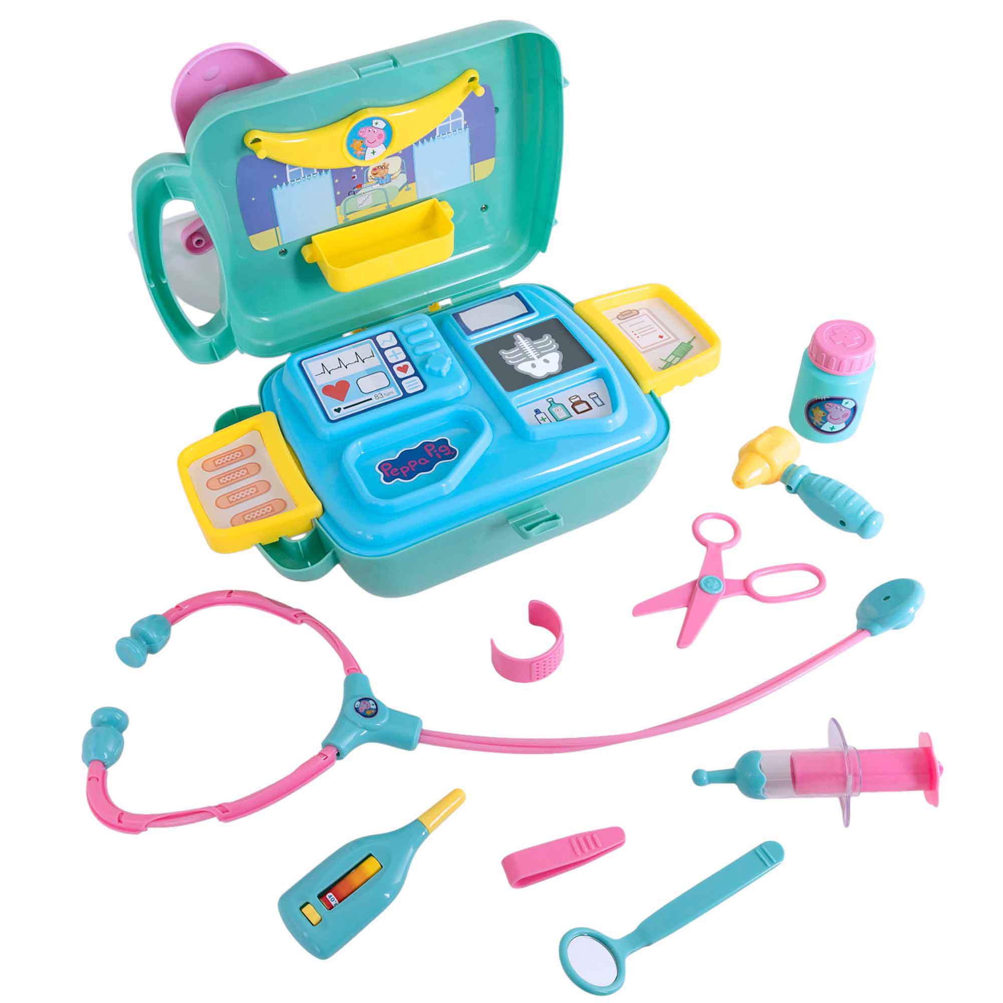 Be just like Doctor Peppa! This carry case contains all the play accessories you need to be just like a real medic. Open the case, apply the stickers, attach the hooks and shelves, place the counter into the base of the case with the side panels attached and you're ready to start treat your patients. Contents include a pretend stethoscope, thermometer, otoscope, syringe, plaster, mirror and tweezers. The set also includes X-Rays, Heart Rate Machine And other medical equipment.