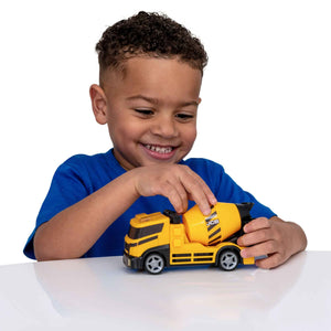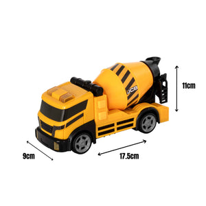 Start your mini construction adventures here, featuring the light and sound cement mixer. It comes with its own manually moveable features with its 360° rotating cab. The Light and Sound vehicles feature yellow flashing lights and realistic engine noises with operating sounds making these construction toys an ideal playset for your child. Let the hours of fun building games commence with the chunky 7" free-wheeling JCB Cement Mixer!