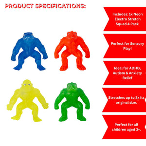 Get ready for a tactile thrill with the Stretcherz Electro Squad 4‑Pack—each vibrant neon figure stretches up to three times its original size before snapping back, delivering endless hands-on entertainment. Featuring two randomly selected characters in each pack from a dynamic sci-fi line up, it’s the ultimate stress-relief twist-and-stretch toy for kids aged 3 and up.