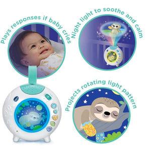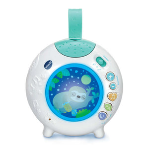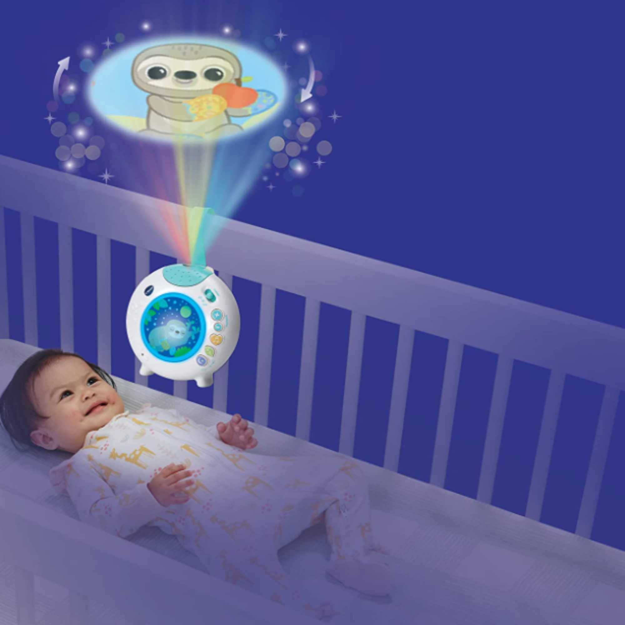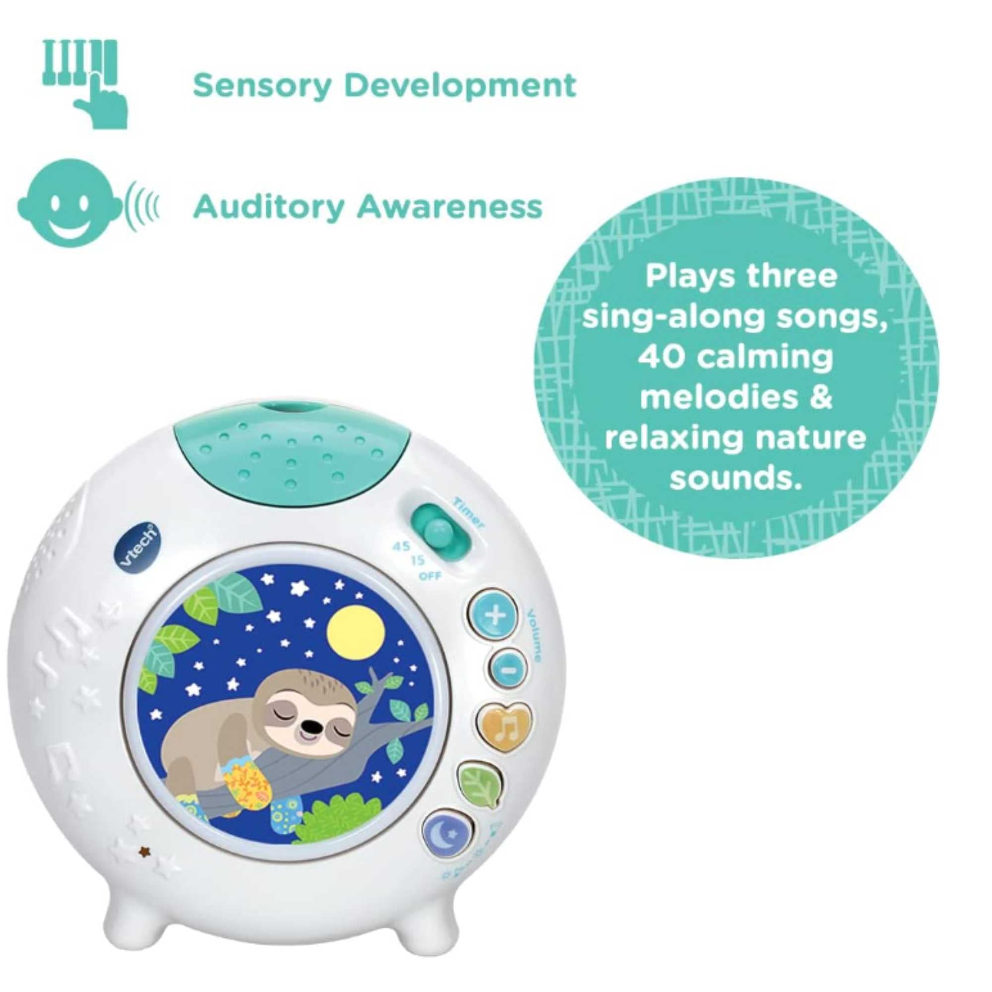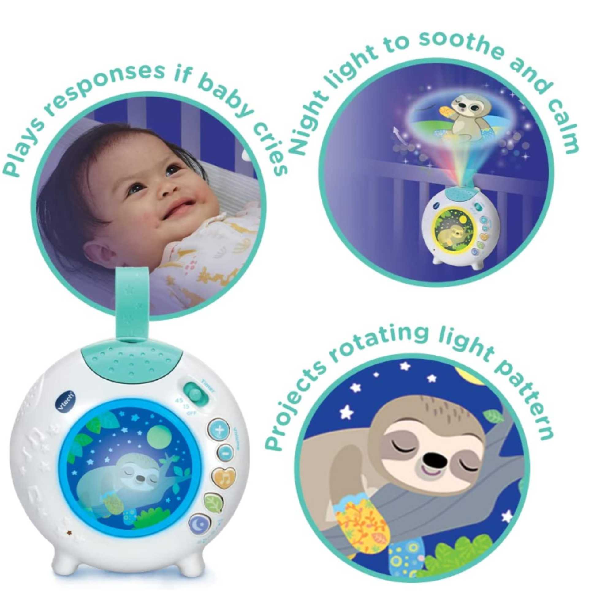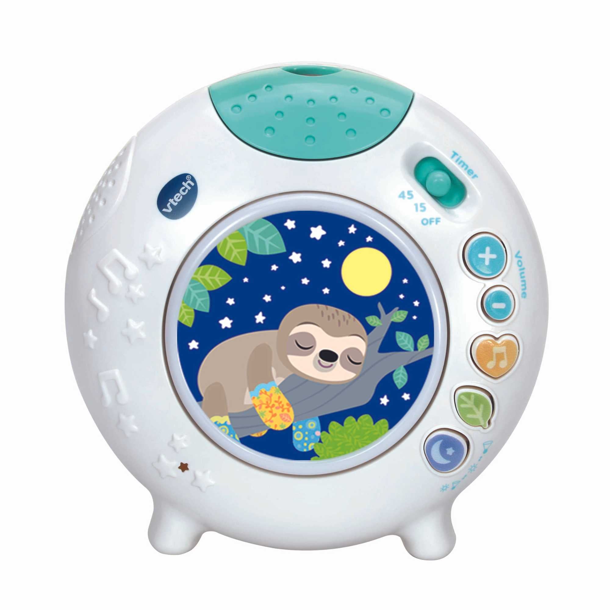 Soothe your baby calmly to sleep with the Sleepy Sloth Cot Light by VTech. Nightlight with Lullabies and Sounds, Press the buttons on this baby nightlight to play soothing responses that calm your little one and send them off to a peaceful sleep. Responses include three sing-along lullabies, 40 calming melodies and relaxing nature sounds. Choose between the two modes to play either music or sounds.