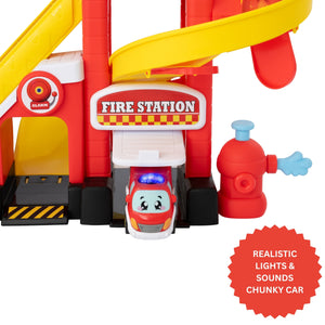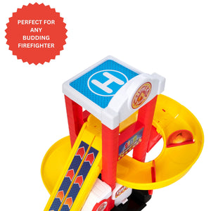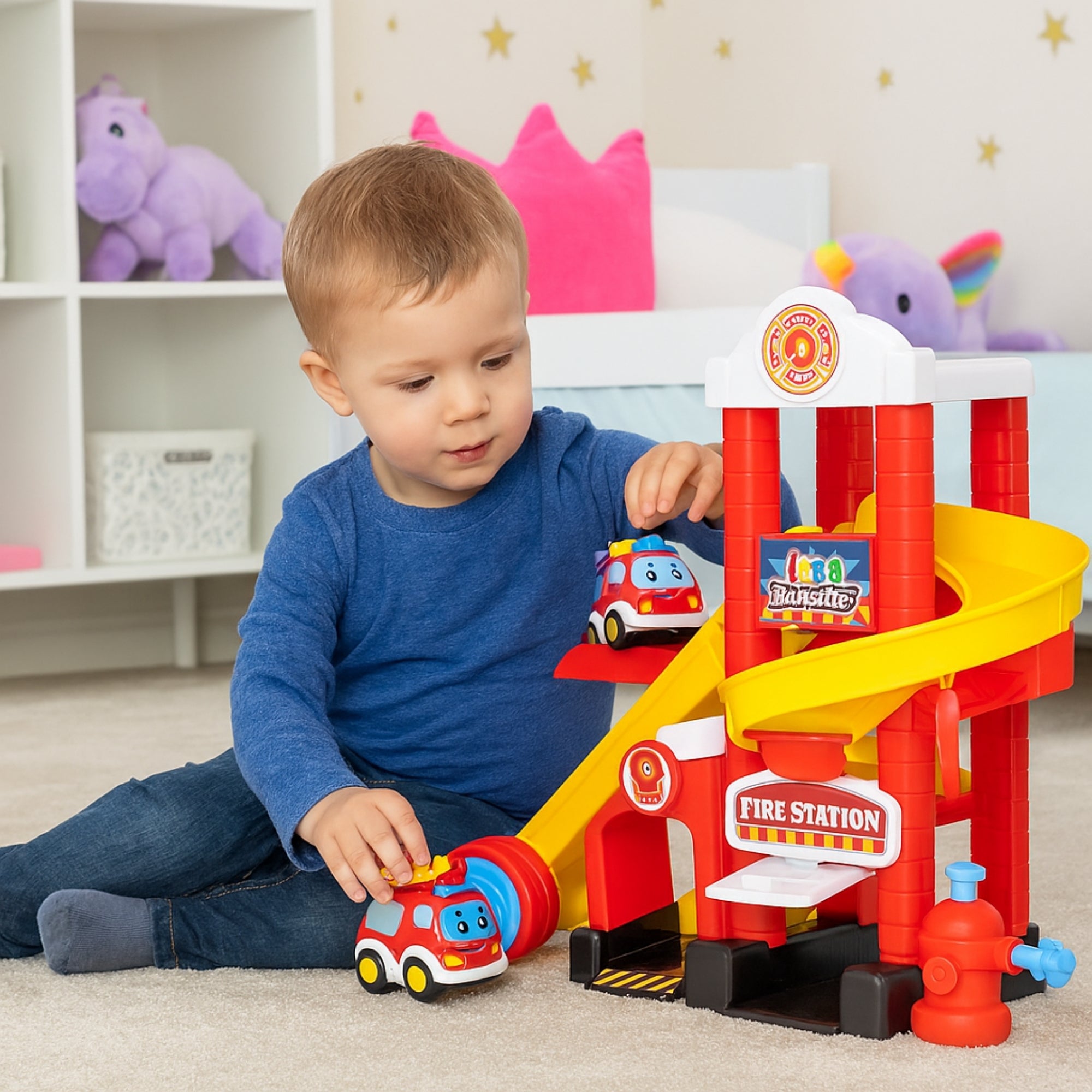 The playset is bursting with engaging features that keep young minds active and entertained. From the wind-up sliding lift and spiral racetrack to the interactive fire hydrant, helipad, and drive-through fire station doors, there’s something new to discover during every play session. The flashing lights and sound effects on the fire engine bring action-packed rescue missions to life, making this set ideal for toddlers who love fire trucks, sirens, and hands-on adventure.