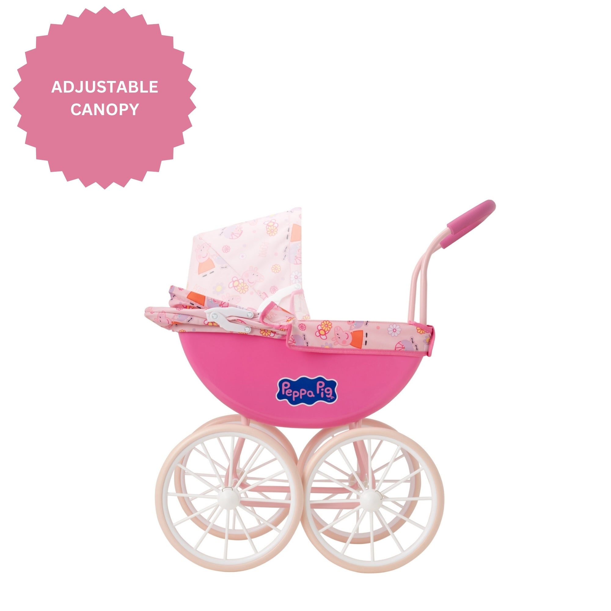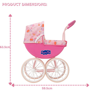 Let your little one stroll in style with the Peppa Pig My First Carriage Dolls Pram – a charming and beautifully designed pram perfect for toddlers who love imaginative play. Featuring adorable official Peppa Pig fabric on the adjustable hood and removable apron, this pink pram brings the world of Peppa Pig to life in the most delightful way.
