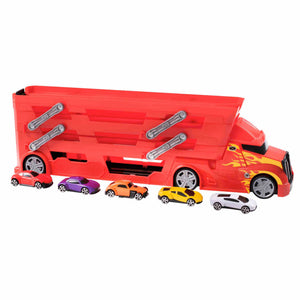 Transport your cars with a twist with the Launcher Transporter with 5 cars. The sleek and durable freewheeling transporter has 3 expandable levels and features an inbuilt car launcher. Supplied in a vibrant red with cool graphics, this portable and highly manoeuvrable transporter comes with 5 die-cast vehicles and space to store up to 37 cars. With the ability to connect track sets for broader play, the Teamsterz Metro City Launcher Transporter is sure to impress young car fanatics.